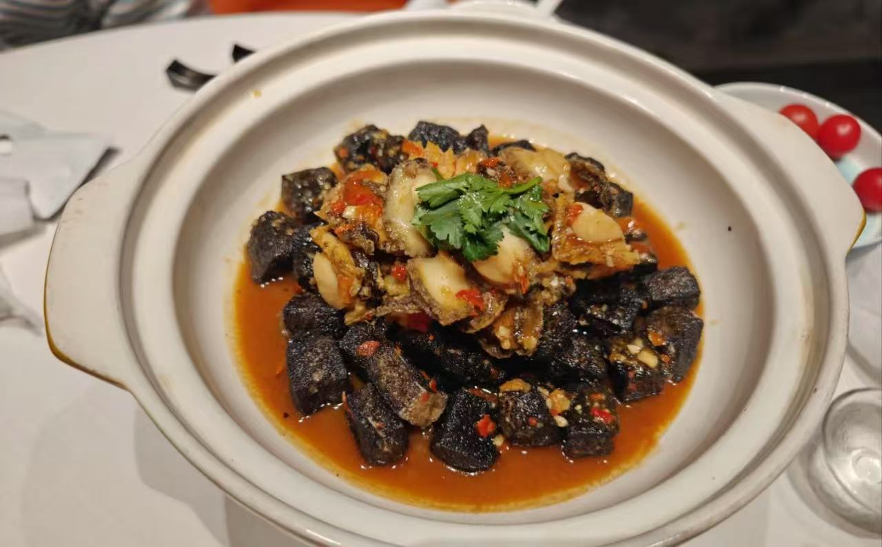 于是,从这样的“灵机一动”开始,如今在湘菜馆能见到不少用臭豆腐做的“创新菜品”,从起初流行于市井的臭豆腐小龙虾、臭豆腐烧猪脚、臭豆腐煨甲鱼,再到如今开始有愈演愈烈之势:臭豆腐烧煨罗氏虾、臭豆腐牛蛙锅、臭豆腐烧鲍鱼……