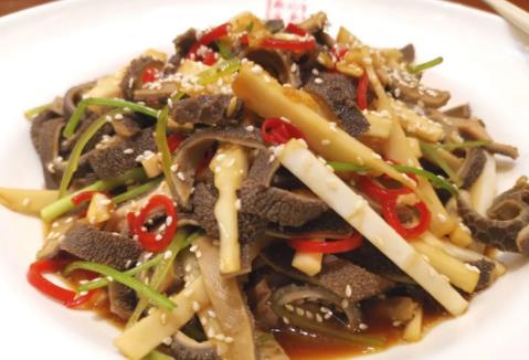 槟榔芯拌羊肚,槟榔芯焯水入冷水过凉,改刀成条;熟羊肚亦改刀成条状;槟榔芯、羊肚入盆,加熟海盐、鸡粉、生抽、香油拌匀,即可大展风彩。