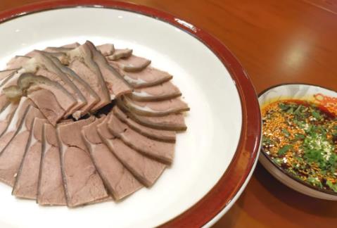 白切羊肉,煮好的去骨羊前腿肉趁热出锅;取干净白布一块,铺在案板上,将羊肉平整地摆放在白布中间、包好;用厚砧板平压在包好的羊肉上面10 小时;压制好的羊肉改切成长方片,码入平盘,叠摆成元宝形,刷上香油即可闪亮登场。