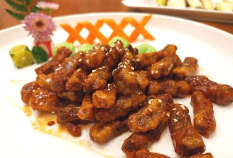 糖醋羊里脊,羊里脊肉切条,用蛋清、海盐、生粉、生抽、胡椒粉拌匀,用手大力抓几下;自发粉用清水兑成较稠的粉浆,放入腌好的里脊肉条令其蘸满粉浆;锅里倒油烧至五成热,放入羊里脊中火转小火炸至淡黄,捞出沥油;将油加热到八成,放入羊里脊复炸至金黄,捞起沥净油;拿一小碗,把番茄沙司、白糖、米醋、羊汤调成芡汁倒进锅里,中火煮开转小火煮至粘稠,把炸过的羊里脊倒入芡汁搅拌均匀,撒上白芝麻即大功告成。