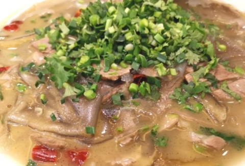 粉皮炖东山羊肉,干粉皮入冷水泡软切块,熟羊肉切片;锅中下入羊原汤、粉皮大火烧开,放入煮熟的羊肉片;烧开后用海盐、味精、鸡精、胡椒粉调好味;撒适量香菜末、青蒜苗末即可。此菜效法浏阳的粉皮羊肉,如今是融合的时代,菜式的融合更能受到消费者青睐,好粉皮炖好羊肉,大快朵颐!