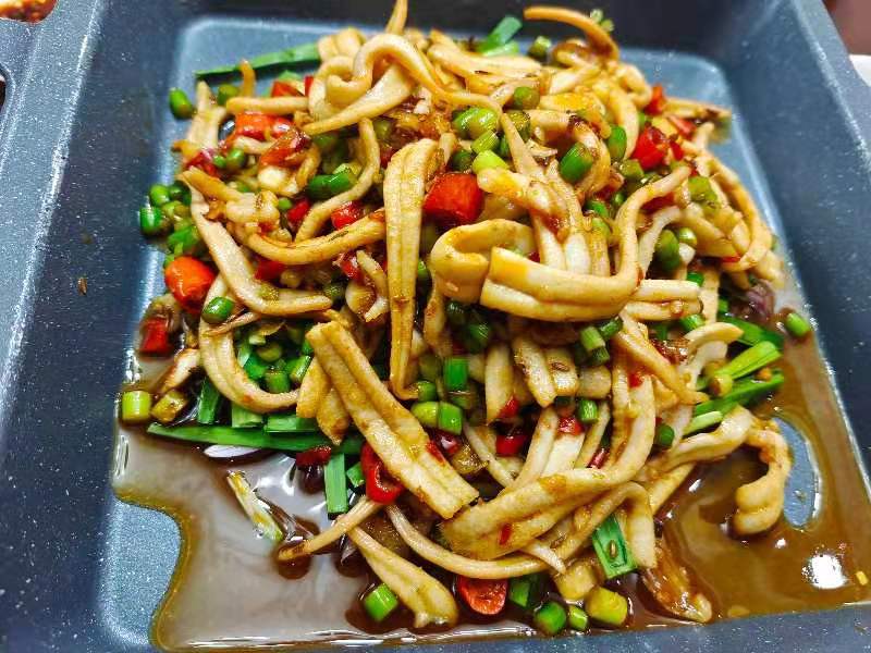 五道制作精美、造型亮眼的“湘凉”,率先展示了湘厨们对于食材搭配以及烹饪、调味技巧的精准把控。脆爽萝卜、酱椒生抽拌贝边所呈现的酸辣味型,能够在餐前起到开胃、唤醒味蕾的作用;而火辣皮蛋、发财凤爪、劲霸小海鲜捞,则用最经典的食材,辅以剁椒、劲霸捞拌汁、老谭酱油,调出更纯粹的湘式口味。这些凉菜不仅在口味上保持着湖南特色,在造型上也十分讲究,体现着湘厨们与时俱进的审美和创新意识。湘鄂源鱿鱼丝、映湘红窖坛酱椒鱼头王、聪厨小炒黄牛肉、许大师扣肉王、聪厨柴火烟笋、湘味源鱼块、湘榀缘湘西腊肉等十余道热菜则将湖南蒸、炒、煮、拌等丰富多样的烹饪方式充分表现出来。