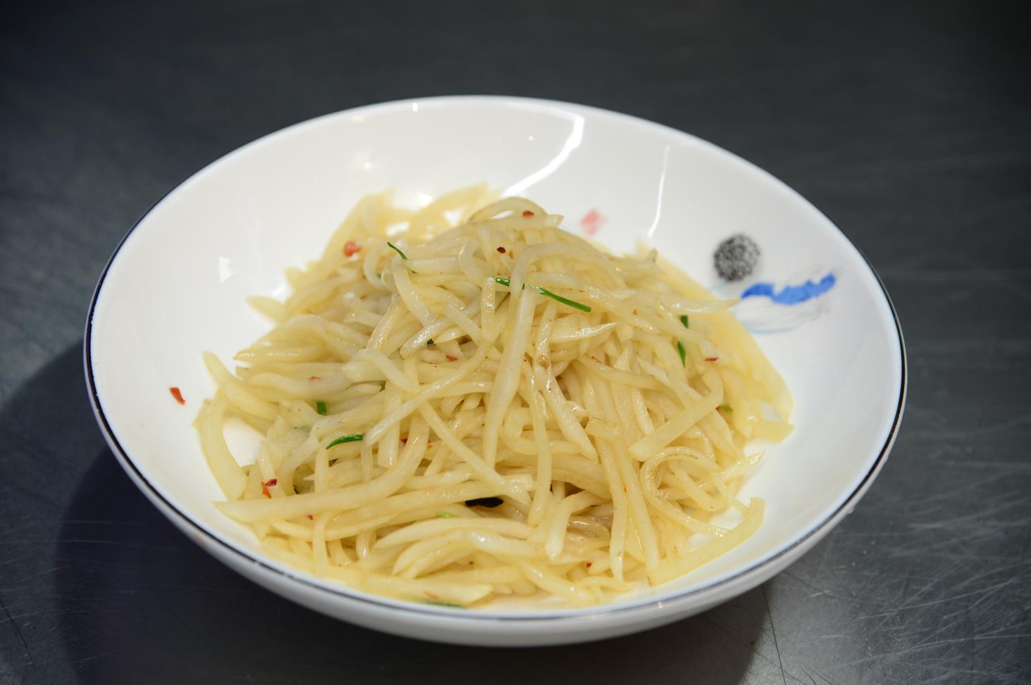 先要将去皮的萝卜切成火柴棍一般粗细均匀的丝,太粗或太细,影响入味,也容易失了口感和卖相。均匀抹上盐腌制十余分钟,挤干萝卜丝吐去的多余水分,这是保持爽脆的关键;用小碗加入生抽、麻油、蒜蓉、少量盐、米醋、淀粉、适量水兑成芡汁;锅中热油,根据口味可炝香干红椒丝或豆豉,再下入萝卜丝,将调好的芡汁快速炒匀,可以适当加入少许葱丝装点菜品后,再出锅装盘。整个菜的完成快速而流畅,集深厚功底于极简的一招当中。