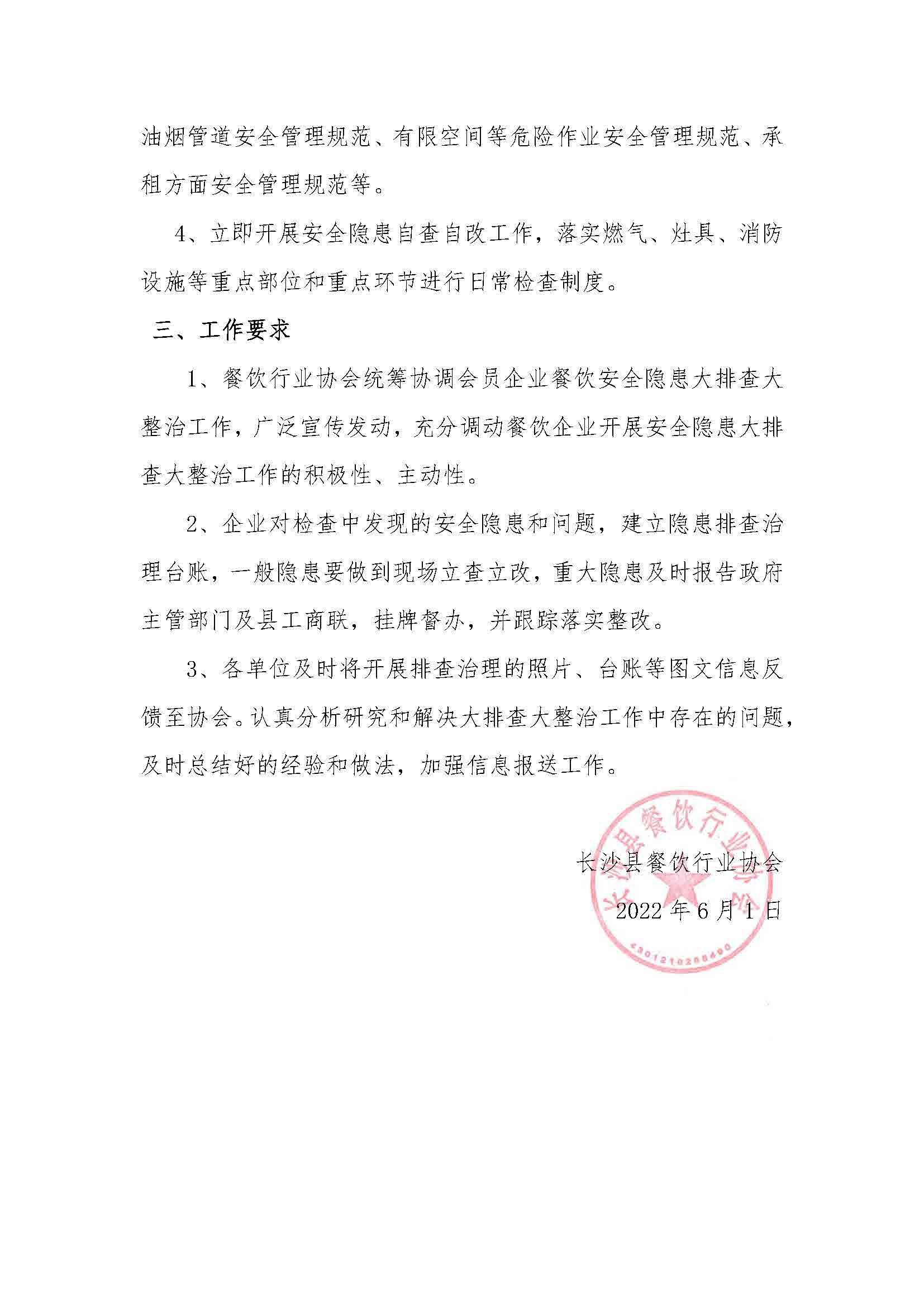 长沙县餐协发布关于开展餐饮行业安全隐患大排查大整治的通知