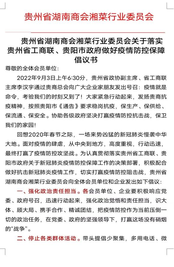 疫情就是命令,危急之处勇担当。积极响应贵州省工商联和贵州省商会联合党委的工作指示,贵州湘菜行业委员会马上向全体会员发出倡议,动员会员参与到抗击疫情的后勤保障工作中,得到广大会员的响应,并向贵阳市疫情防控指挥部发出《参加疫情防控后勤工作申请》,为疫情防控贡献力量。