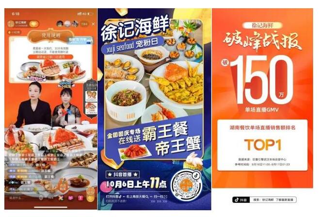首先要解决就是内容,即解决播什么的问题。内容方向决定着直播间场景化的打造和用户的体验感。例如餐企想展示品牌的特色,可以直播产品的制作过程;想展现食材的新鲜及地道,可以直接去到食材基地,徐记海鲜在10月份开展原产地直播,让消费者看到产品的新鲜和活力,展现苏北养殖基地食材的“新鲜”展现的淋漓尽致,GMV达到355万,再次打破全国正餐直播记录。